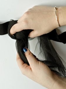 Rakjon össze 2–4 csíkot tüllből, és hajtsa őket hurokba. Tekerje a gumit a hurok köré, és húzza át a végeit a hurok közepén, hogy a tüllszalagokat a rugalmashoz rögzítse. Ez megismétli a folyamatot a fennmaradó csíkokkal, és szorosan összehúzza őket, amíg a teljes rugalmas szalag be nem borul.