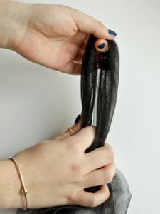 A tutu szoknyával kezdjük azzal, hogy megmérjük a gyermek derekát, és ezt átvisszük a fekete rugalmas szalagra. Jelölje meg a szalagot ceruzával, és vágja le a szalagot a jelnél. Vágjon két darab körülbelül 50 cm hosszú fekete szalagot, és hajtson át egy szalagot a rugalmas szalag mindkét végén. Helyezze be a tűt a rögzítéshez és a varráshoz. Most vágja a tüllt kb. 60 cm széles darabokra éles ollóval, változtatva a hosszúságot, hogy szaggatott széle legyen. Tekerje fel a tüllt, mérje meg és vágjon 3 x 10 cm -es részeket. Tegyen félre egy tüll csíkot, hogy később megfűszerezze a kalapot. Ezután vágja le a csíkokat középen, hajtsa őket hosszirányban és vágja a hajtásnál. Ezután végül vágja le minden végét szögben, hogy a szaggatott végei láthatóvá váljanak,