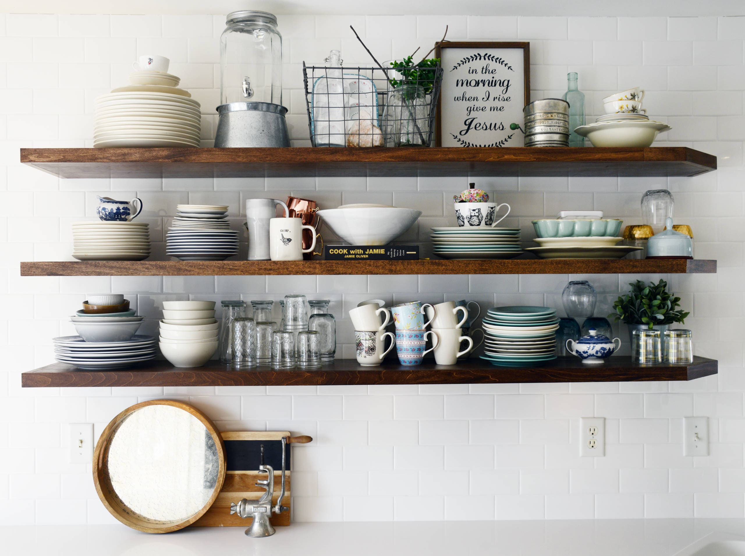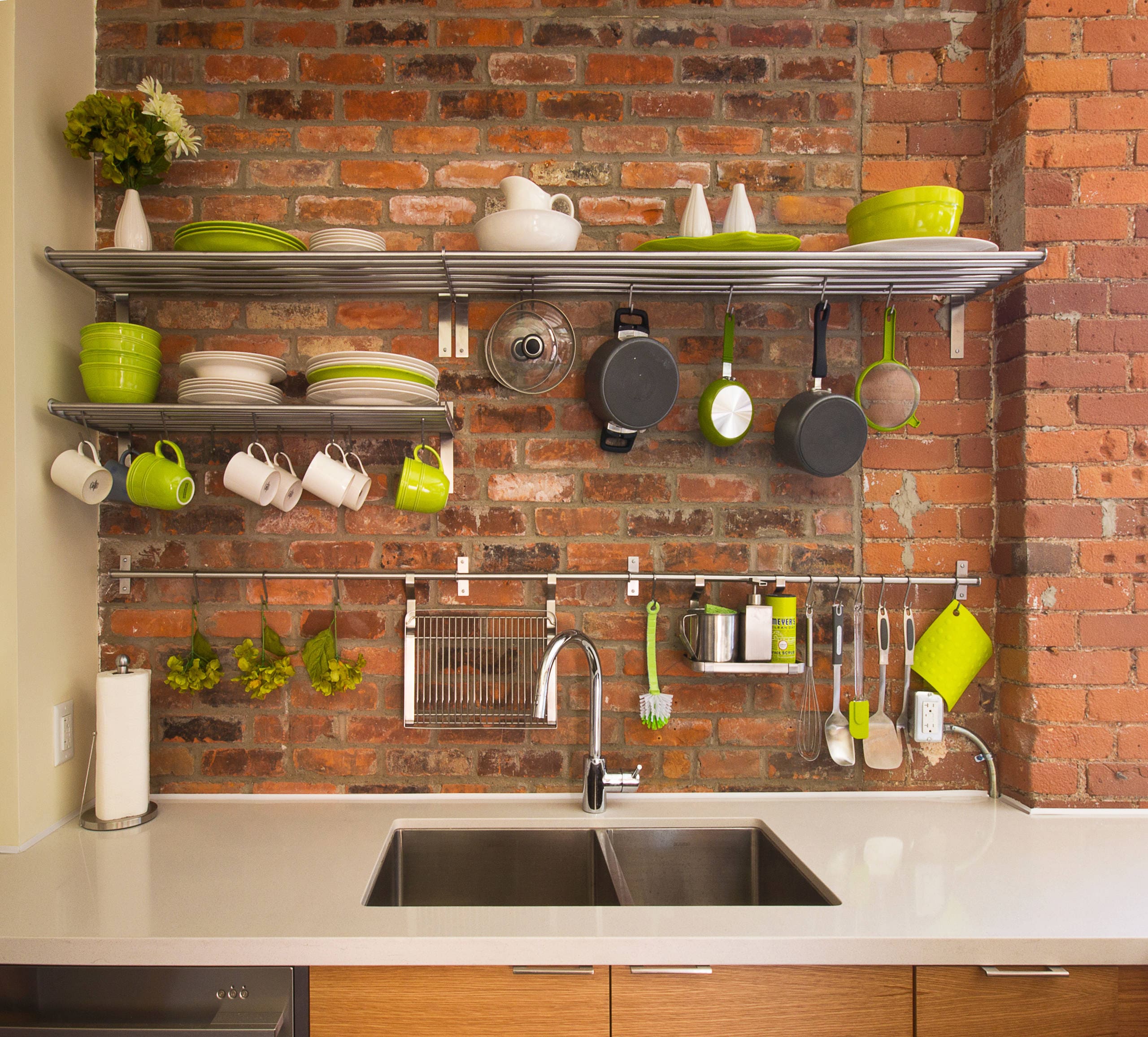 Probeer naast wand- en vloerkasten ook de wand aan te passen voor extra opbergruimte voor spullen die je elke dag nodig hebt. Dit kunnen rails zijn met haken voor mokken/deksels/bestek, hanging baskets, open planken, etc. Naast de praktische voordelen is dit ook een geweldige manier om een vrije muur in de keuken te decoreren, die anders gewoon door kasten zou worden afgesloten..