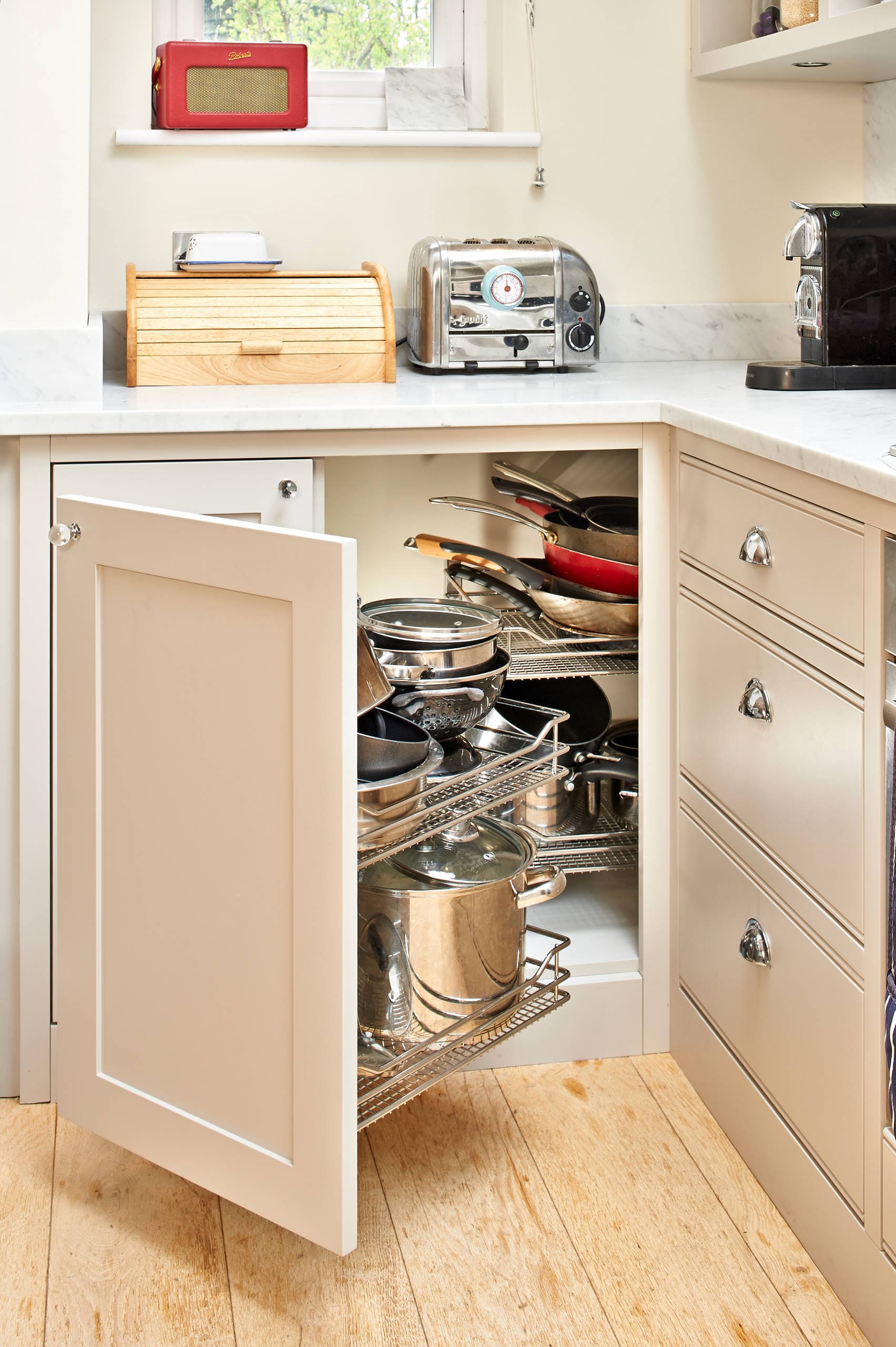 Een ander leuk idee is een “slimme hoek” met uittrekbare planken, draaibare constructies, dakrails, zoals bijvoorbeeld op onderstaande foto. Gebruik deze stijlvolle oplossingen om toegang te krijgen tot ruimtes die meestal niet worden gebruikt en om daar grote potten, pannen en andere omvangrijke voorwerpen op te bergen. Ze passen perfect in een brede hoekruimte en het zal gemakkelijk en eenvoudig zijn om ze daar te verwijderen, wat de functionaliteit van uw keuken aanzienlijk zal vergroten..