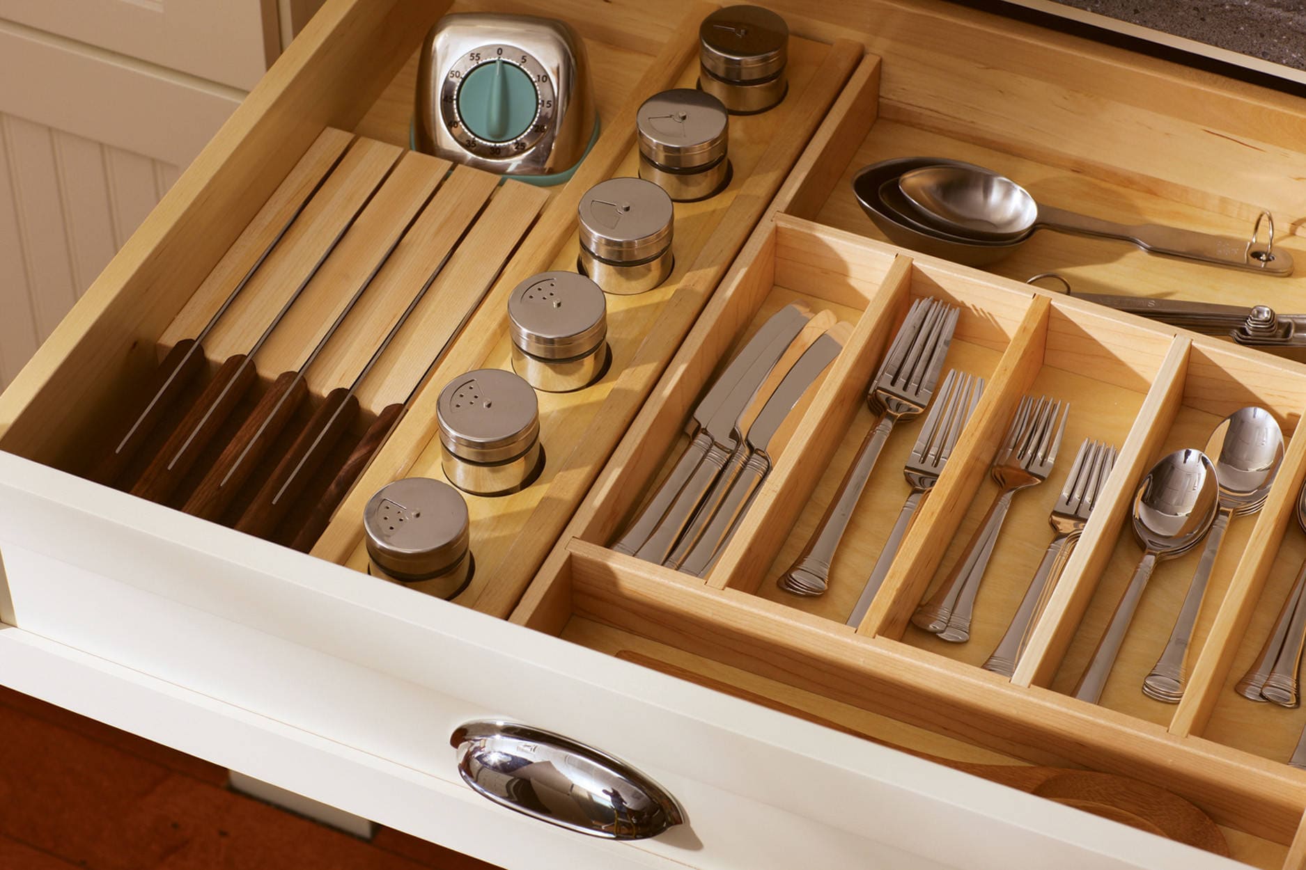 Gebruik keukenopbergers en berg al je keukengerei op in aparte secties. Individuele cellen zullen je motiveren om na gebruik alles op zijn plaats te zetten. De meest geavanceerde opbergers bevatten vakken voor messen..
