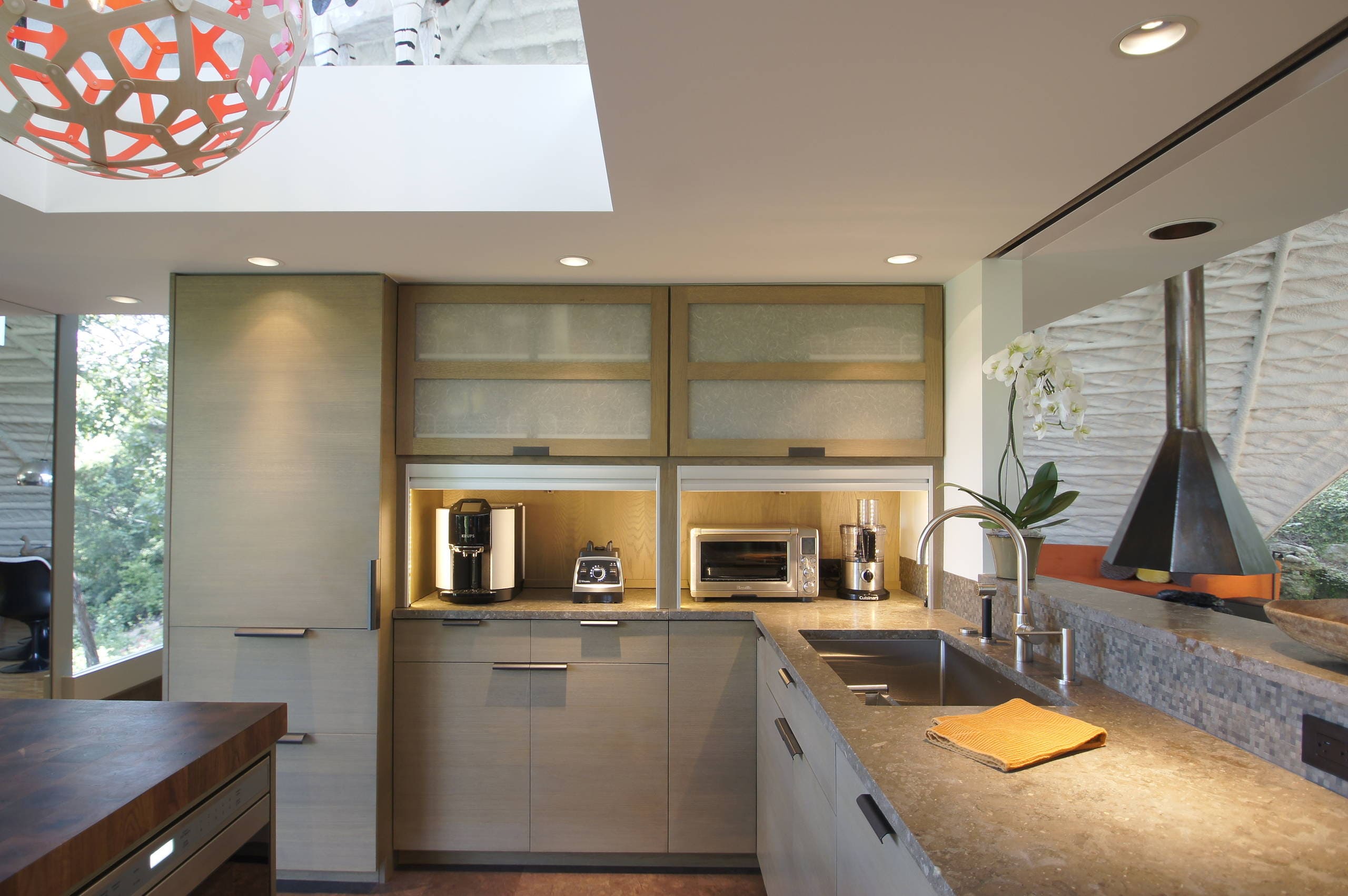De eerste indruk is belangrijk, dus houd je aanrechtblad leeg. Het uiterlijk van uw keuken steekt gunstig af als u geen lange rijen huishoudelijke apparaten ziet, het maakt ook ruimte vrij voor het bereiden van voedsel en direct koken. Een niet-standaard idee is om een soort “garage” te voorzien voor het opbergen van huishoudelijke apparaten, dat is een open ruimte achter een deur die naar boven opent (zie foto hieronder).