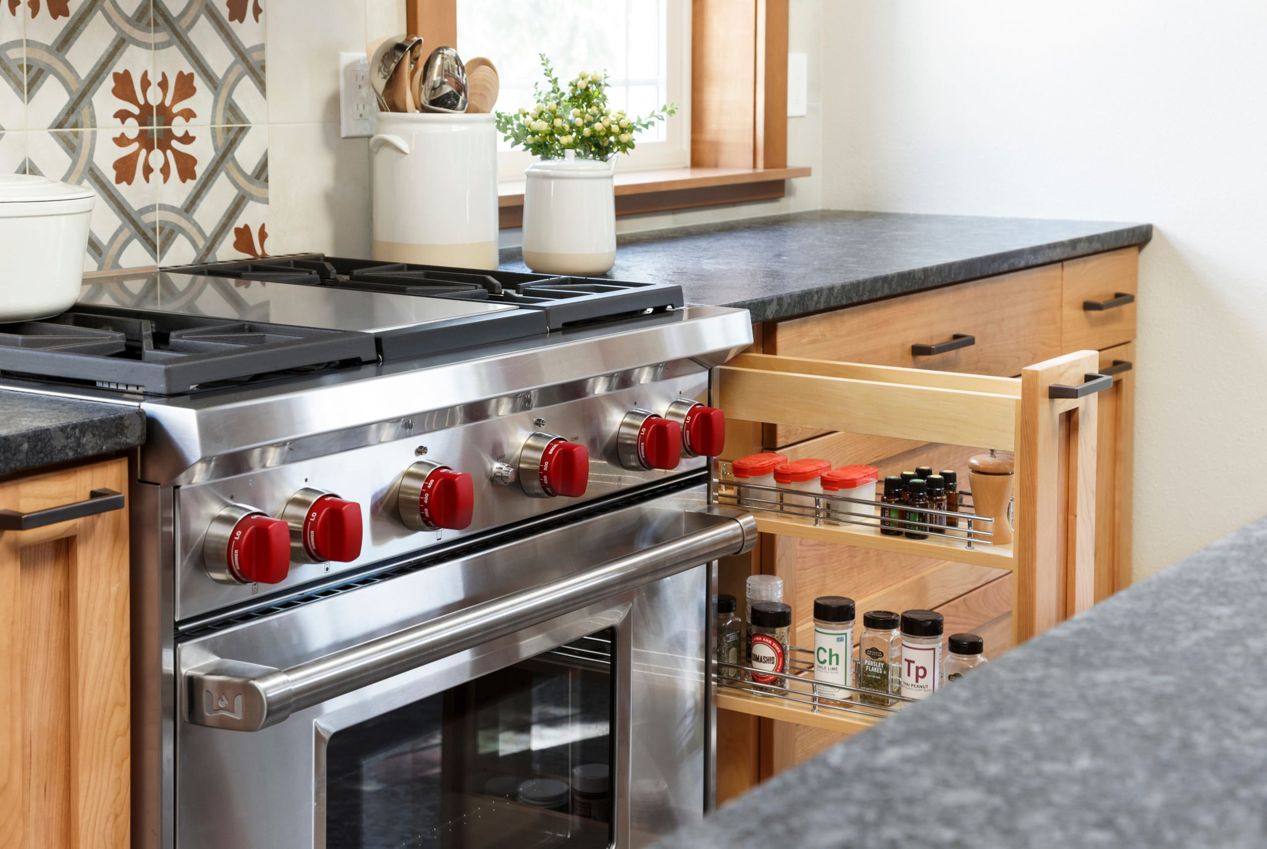 Bijna niemand betrapte zichzelf op het idee dat er genoeg opbergruimtes of zelfs veel in hun keuken zijn. Omdat keukens niet altijd een lineaire indeling hebben, vinden we er vaak “dode” zones op. Versier hoeklades en andere “lege” ruimtes in je keuken met opbergruimtes. In deze keuken vult bijvoorbeeld een lade voor kruidenopslag de geforceerde maar lastige opening tussen het fornuis en de lades perfect. Kijk rond in alle hoeken en gaten, het zal waarschijnlijk niet moeilijk voor je zijn om ze allemaal te vullen.