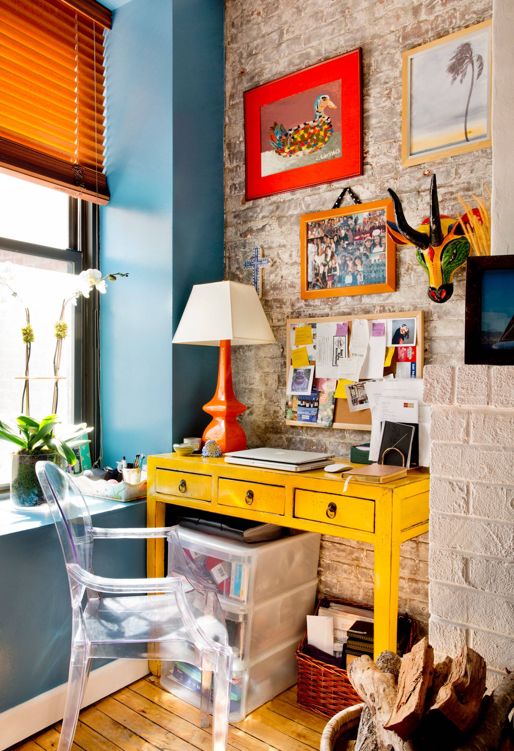 Decoratieve verlichting, stoelen in verschillende kleuren zullen een kleurrijk interieur creëren zonder toevlucht te nemen tot extra accessoires. Kunsttijdschriften, vintage boeken, foto’s die je leuk vindt van internet zijn een geweldige bron om kleur toe te voegen aan je appartement. Knip de foto’s die je leuk vindt netjes uit, lijst ze in en hang ze aan de muur. Wanneer u het interieur wilt diversifiëren, zal het niet moeilijk zijn om de schilderijen binnen het kader te vervangen..
