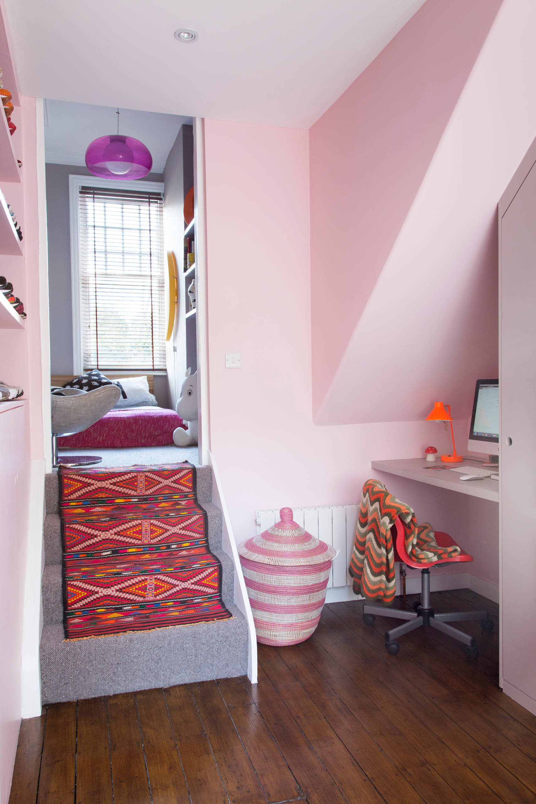 Roze muren combineren met gedurfde accenten om een gedurfd interieur te creëren, terwijl centrale designelementen zoals dit tapijt met patroon op de onderstaande foto de kleur van de roze muren – in vergelijking – rustiger maken..