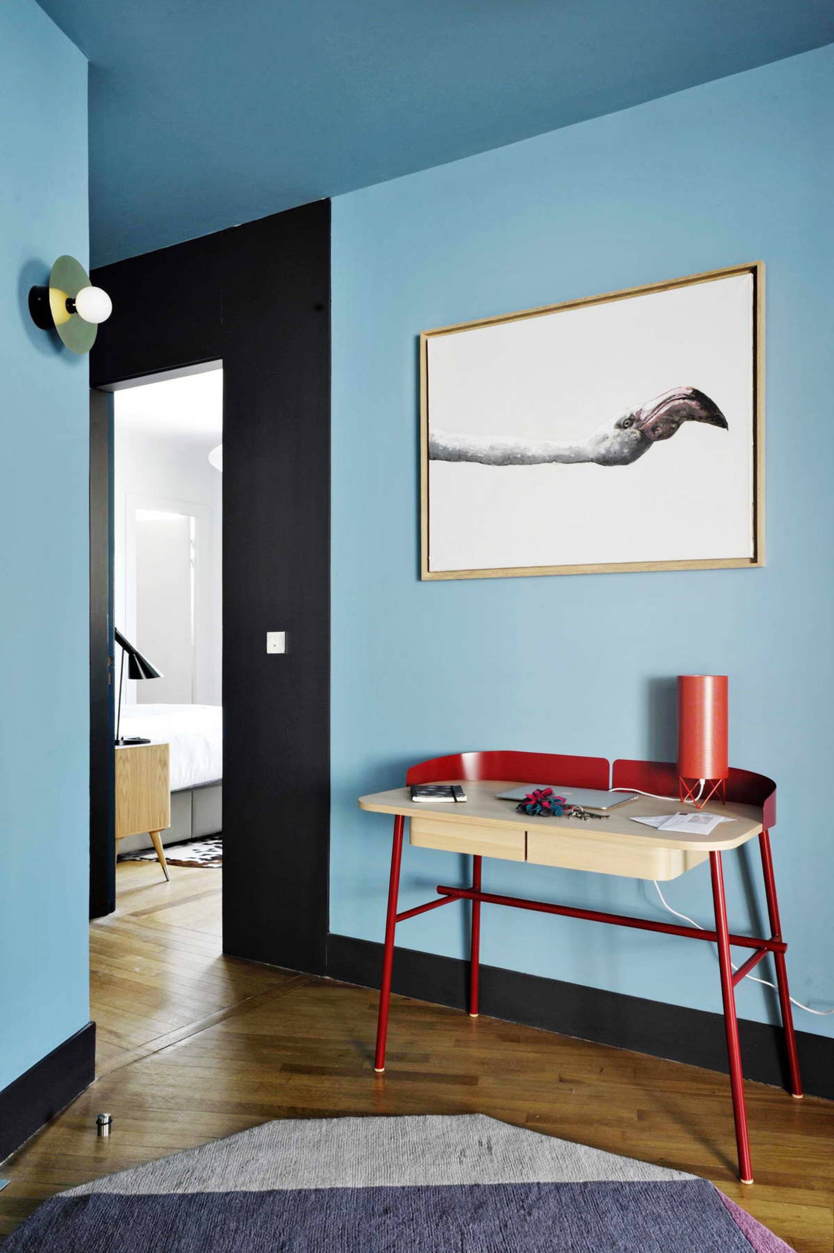 Wanneer we kleuren met elkaar combineren, domineert vaak neutraal het volume. In deze kamer (zie foto) doorbreekt een wit schilderij de uniforme stijl van de blauwe muur en voegt een frisse visuele sensatie toe..