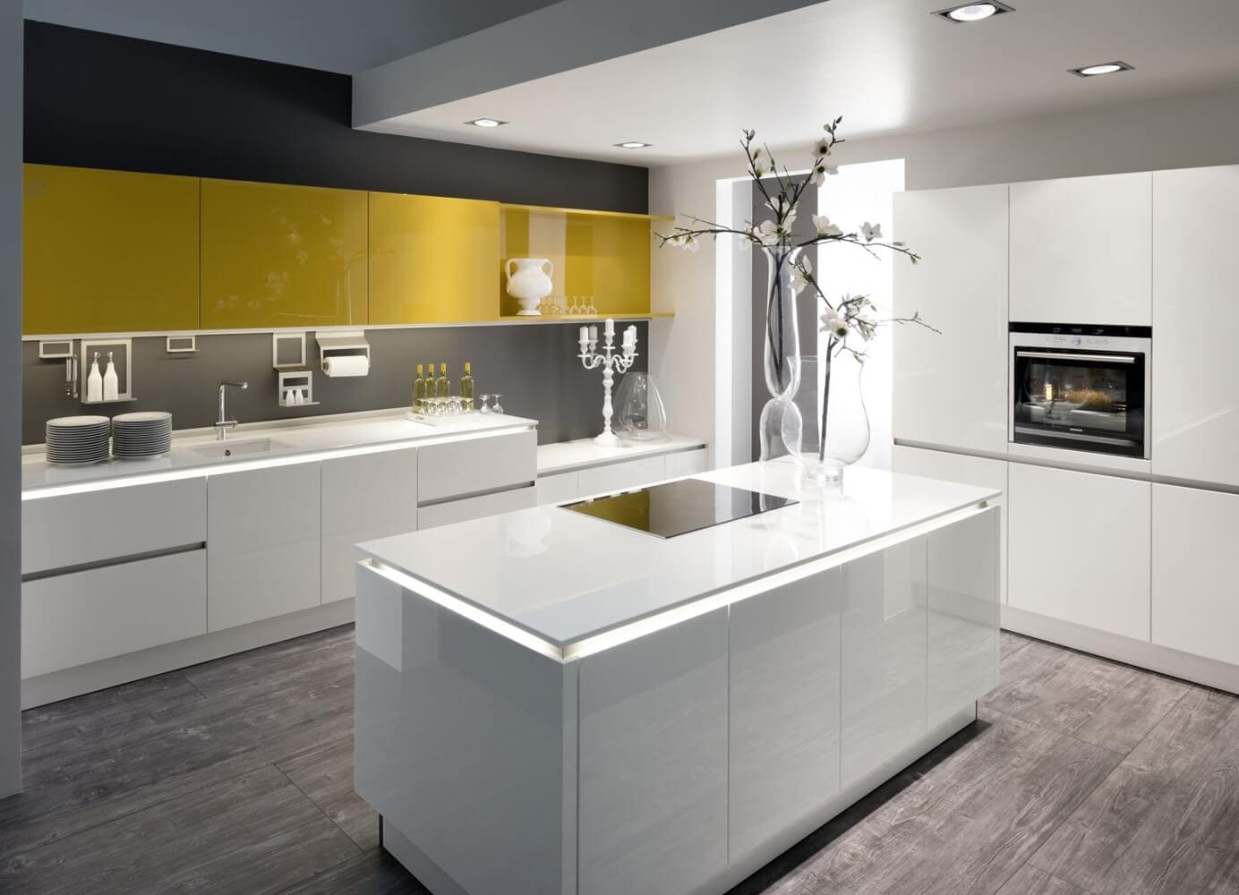 Glas wordt als kwetsbaar beschouwd en hoort niet thuis in de keuken. Het gebeurde zo dat veel mensen glazen gevels als onbetrouwbaar beschouwen, bovendien zijn ze zwaar, moeilijk te installeren en tijdens het gebruik kan het glas worden bekrast of gebroken. Dit materiaal is echter al lang vervangen door een innovatief glaslaminaat, dat veel lichter en sterker is dan gewoon glas. Uiterlijk verschilt het niet van echt glas, en in sommige modellen is de coatingbreedte slechts 20 mm. Daarnaast zijn er veel kleurmogelijkheden..