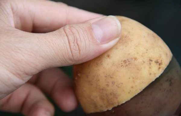 Na het plukken van de bessen kleuren de handen meestal paars of rood. Hetzelfde gebeurt bij het schoonmaken en snijden van bieten. Een paar partjes rauwe aardappelen helpen deze vlekken van je huid te verwijderen. Wrijf je handen in met een knol en na een paar minuten zal de hardnekkige kleur eraf gaan.