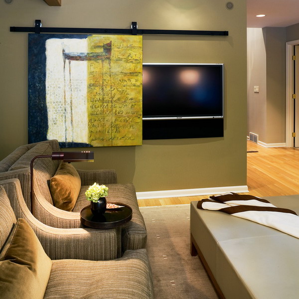 Er is nog een andere manier om je tv te camoufleren: hang hem aan een glanzend zwarte muur. Onder het scherm kan een wand- of vloerladekast worden geplaatst. Het is de moeite waard om aandacht te besteden aan de panelen, die, wanneer ze zijn uitgeschakeld, schilderijen imiteren. Je kunt de tv ook in een kleine nis installeren en je favoriete mooie schilderij of familiefoto als deur gebruiken..
