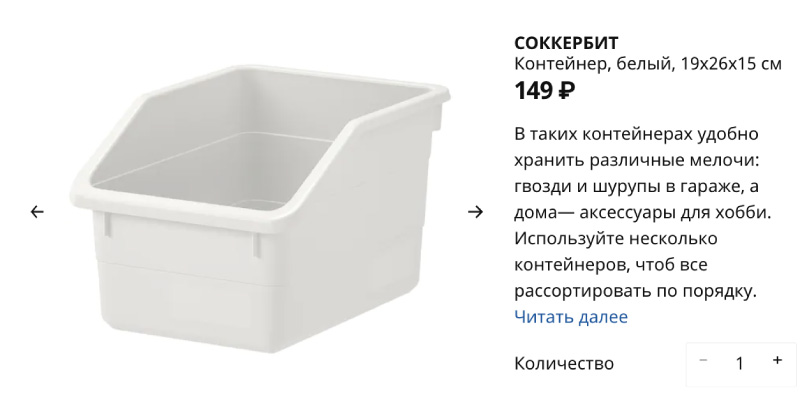 - Afmetingen lade Ikea “Sokkerbit”: 19x26x15 cm, prijs: 149 roebel.