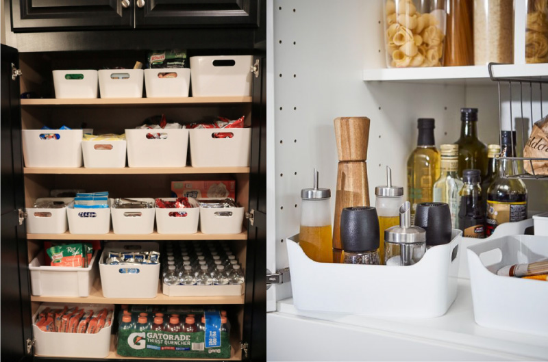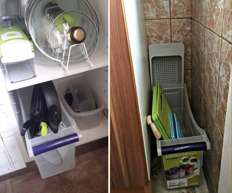 Hiermee kunt u “dode zones” gebruiken (bijvoorbeeld een plaats onder een gootsteen, openingen tussen meubels en een muur, enz.), Compact en verticaal opslaan van huishoudelijke chemicaliën, pannen, planken en nog veel meer. Dergelijke containers kunnen niet alleen in Fix Price worden gekocht, maar ook in Auchan, Lenta, Carousel, Traffic lights en vele andere offline en online winkels..