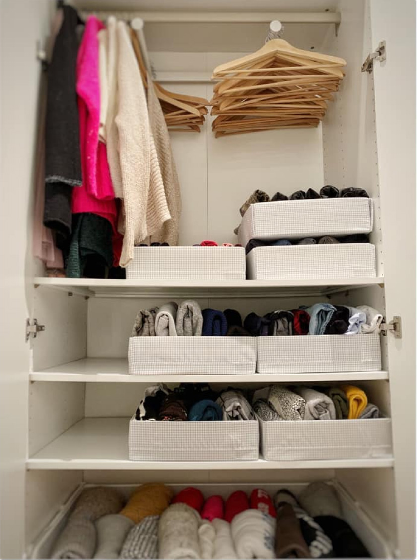 Als je het boek hebt gelezen, weet je dat Marie Kondo het overmatig gebruik van hangeropslag sterk ontmoedigt, omdat ruimte oneconomisch wordt verspild. Het grootste deel van de kledingkast zou volgens de expert planken moeten zijn. Als er niet genoeg planken in de kast zijn, zullen hangende modules van de Skubb en Knock-serie u helpen..