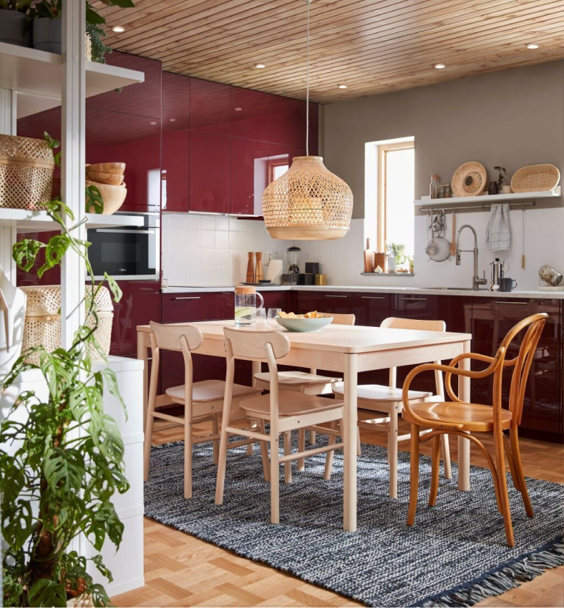 Количката не е единственото, което може да бъде червено. Ако преди топката беше управлявана от зелено, догодина IKEA залага на червени или бордо стени и кухненски фасади. Тези топли цветове трябва да се комбинират със студени сиви и естествени дървесни нюанси..