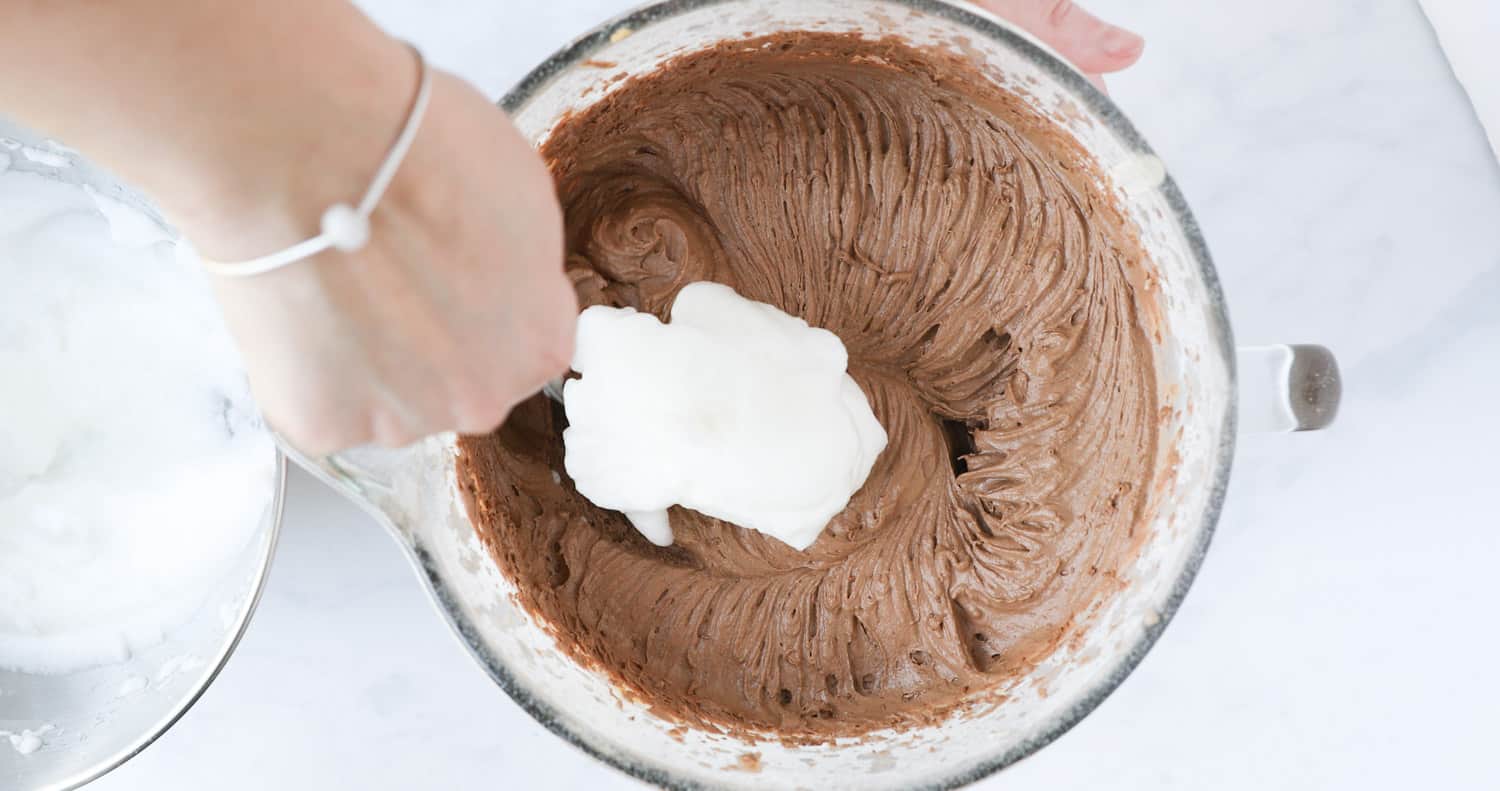 12. Egy külön tálban a tojásfehérjét kemény habbá verjük, majd a tojásfehérjét beleforgatjuk a tésztába. Nagyon óvatosan hajtsa össze, nehogy kifújja a levegőt a keverékből! Ezután hozzáadjuk a felvert tojásfehérjét.