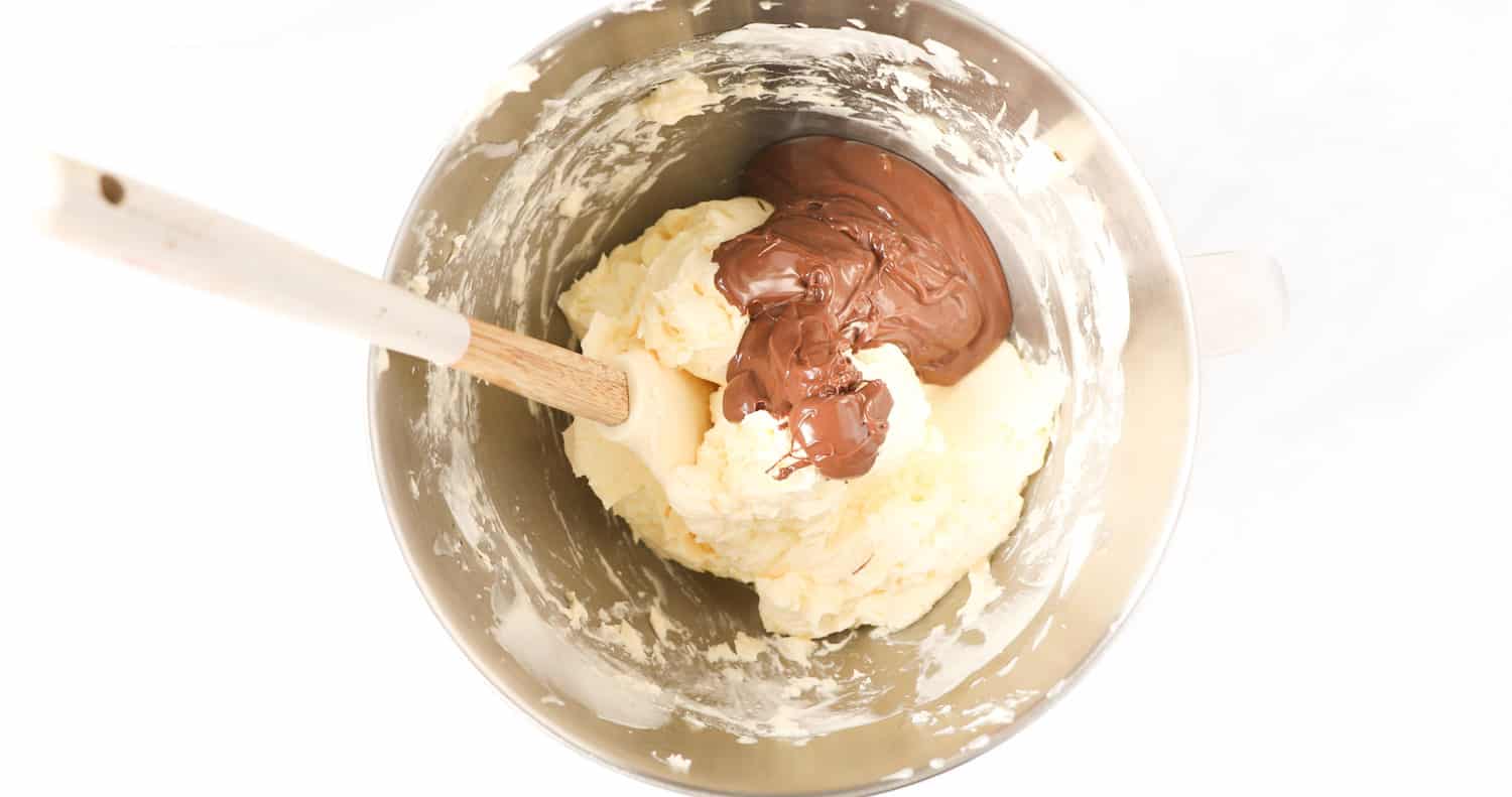 - Adjunk hozzá egy teáskanál vaníliakivonatot és 200 g Nutellát a vajkrémhez, és addig keverjük, amíg teljesen el nem keveredik.